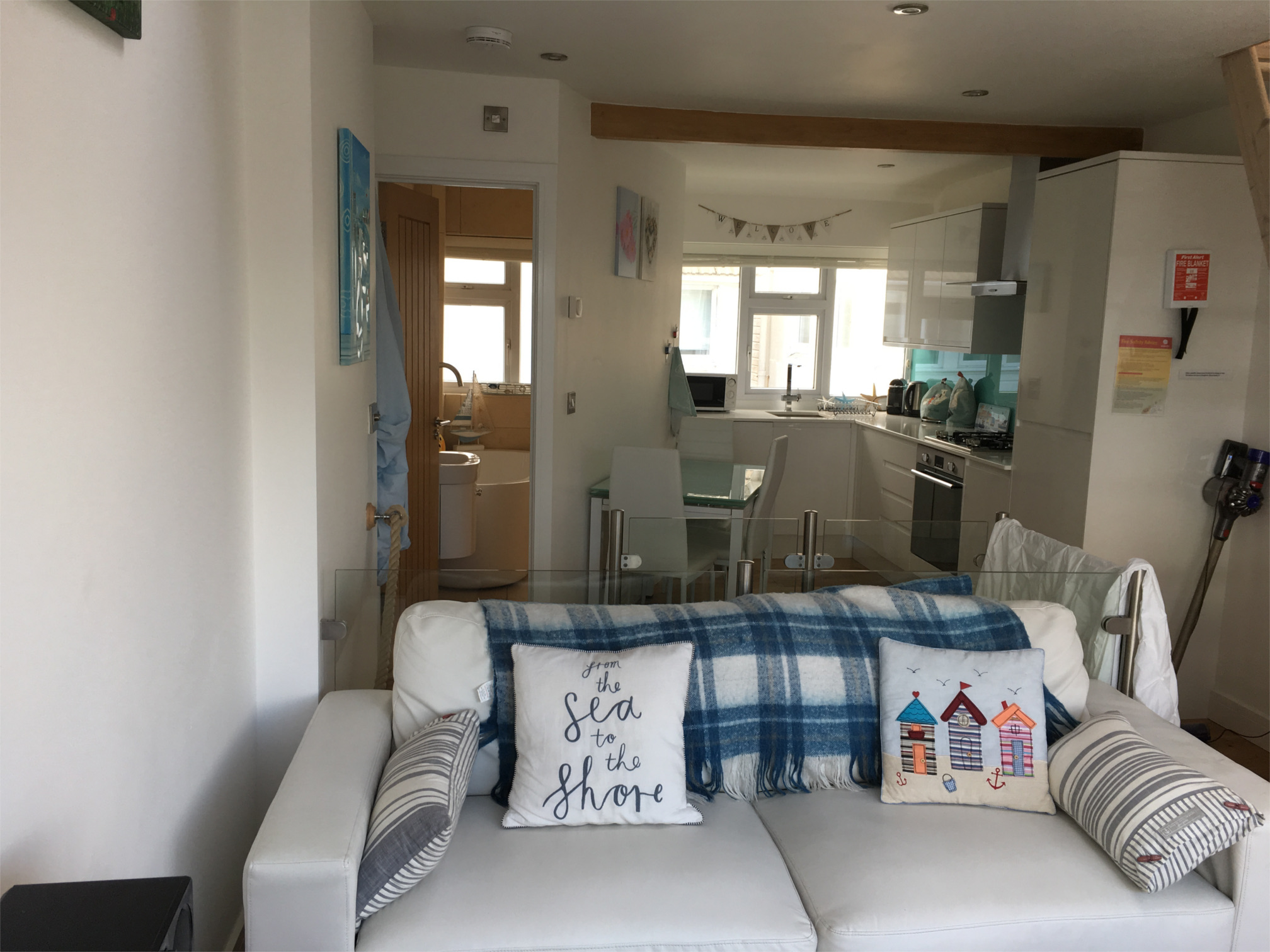 The property has hard wood flooring throughout (both bedrooms are carpeted), which is easy to keep clean with all the sand that comes in, and benefits from central heating. The stairs lead to the open plan first floor space with a kitchen/diner and living room with great sea views where you can watch the sun rise and storms blow in. There is a separate bathroom on this level with a bath, toilet and sink.